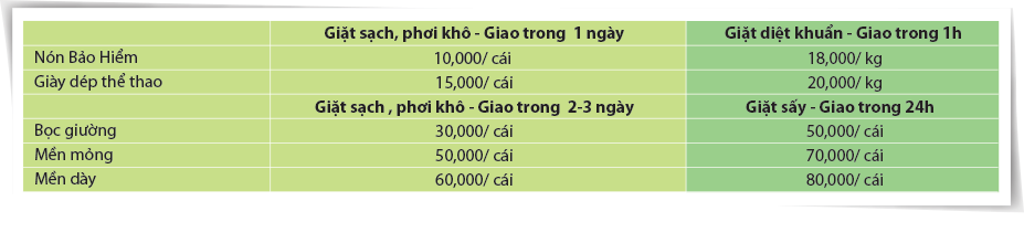| Gói giặt | Chi tiết | Bảng giá (VND) |